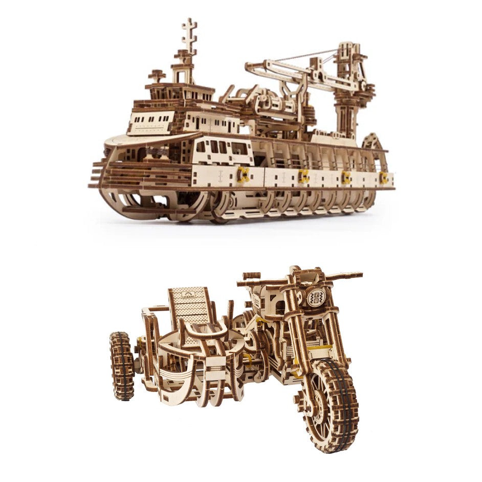 Introducing Winter Bundle #6: a dynamic mechanical duo featuring the UGears Motorcycle Scrambler UGR-10 with Sidecar and the UGears Research Vessel. This winter-exclusive set combines rugged adventure with ocean exploration — perfect for builders, collectors, and gift-givers.