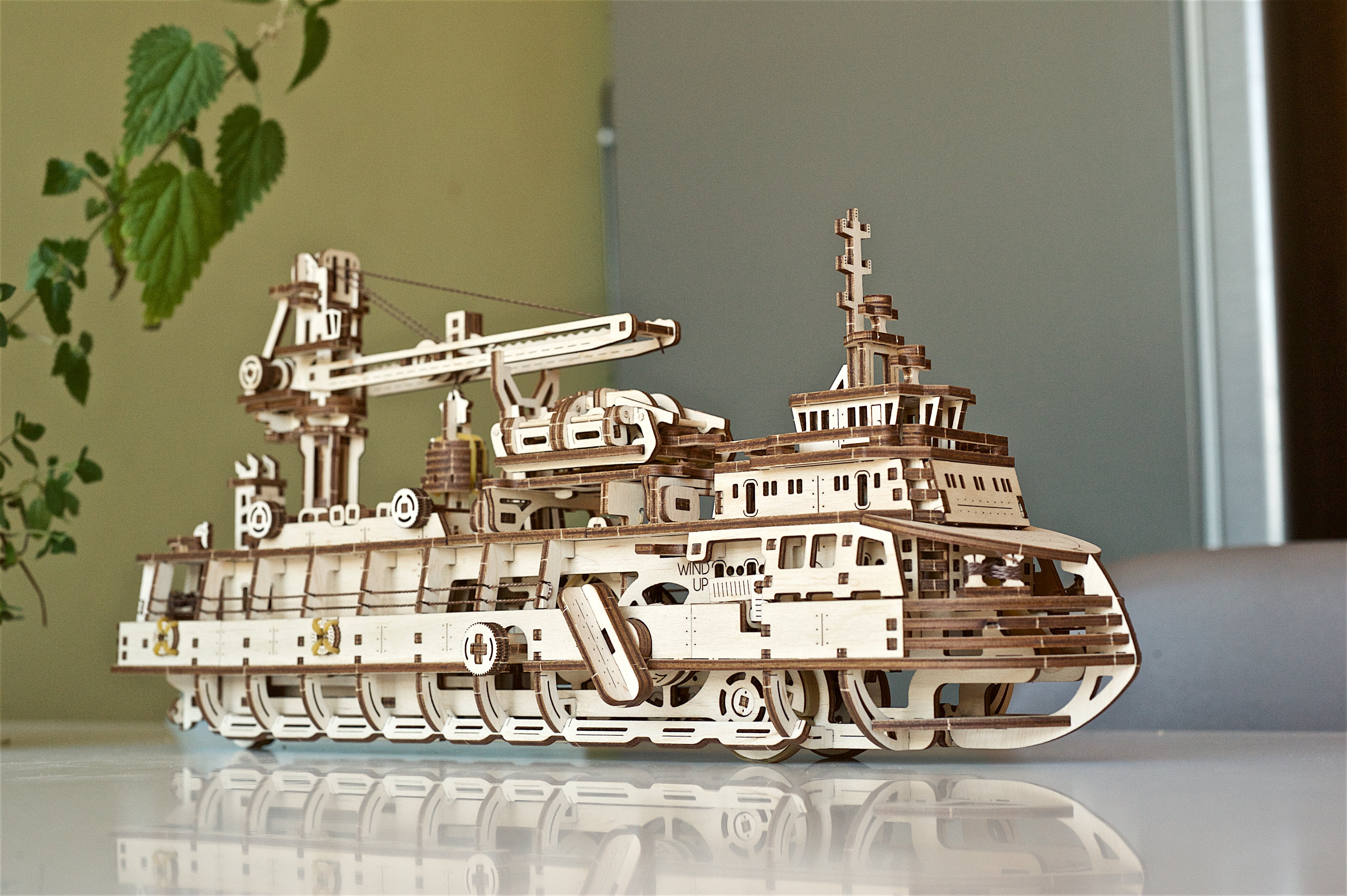 A beautifully engineered marine exploration ship equipped with a movable crane, working winches, a mini-submarine, and a helipad. This model captures the spirit of scientific discovery and offers a rich, hands-on experience through its intricate moving components.